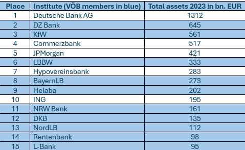 The Association of German Public Banks (VÖB) is a leading association of the German banking industry and belongs to the German Banking Industry Committee (GBIC)*. Our members cumulated total assets account to more than 3,029 billion euros, constituting approximately one quarter of the German banking market. They serve companies, SMEs, the public sector, and retail customers and are firmly rooted in their home regions in Germany. VÖB is also an employer association, our members employ more than 60.000 staff.