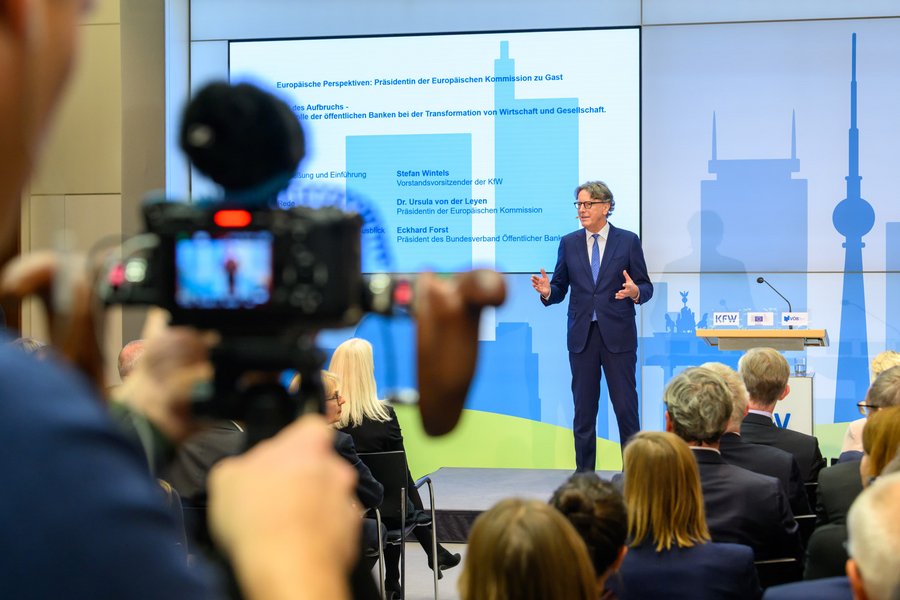 Stefan Wintels, Vorstandsvorsitzender der KfW, sprach über 75 Jahre KfW, die Rolle der Förderbanken und Europas. Förderbanken sind vor allem dort gefragt, wo der Markt und Geschäftsbanken noch zurückhaltend sind, und Finanzierungslücken bestehen, die geschlossen werden müssen. Rahmenbedingungen für die Stärkung der europäischen Wettbewerbsfähigkeit sowie einer nachhaltigen Transformation müssen noch geschaffen werden.